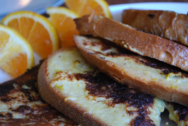 Tomorrow morning is set to be a rainy one here in Brooklyn. Maybe the perfect time to make French toast. French toast is not really the type of thing you should eat all the time, but when you do, you might as well do it up. This version uses a fluffy white artisanal loaf and features the delicious combination of orange, vanilla and maple syrup. The key is to really get the bread saturated with egg mixture until it is almost falling apart. I fry my French toast in a combination of butter and coconut oil. The coconut oil resists smoking and adds another layer of perfume-y but not over the top flavor. If you don't happen to have coconut oil, just use something neutral. French Toast with Orange (serves 3 or 4) 5 eggs 1 1/2 cups milk 1/2 cup fresh squeezed orange juice 1 tablespoon sugar 1/2 teaspoon of salt, heaping if you have a salt tooth like me 1 tablespoon real vanilla extract 6-8 thick slices of bread, preferably something fluffy or spongy 2 tablespoons butter 1-2 tablespoons coconut or neutral oil a couple grates of orange zest and maple syrup for serving Put a large platter into the oven and heat it to 170 degrees. Put the biggest frying pan you have on the stove over medium heat while you prepare the French toast. The lengthy pan heating makes for more even heat and perfectly cooked French toast. Break the eggs in to a large bowl and beat, whipping air into them. Then whisk in the milk and orange juice, and then the salt, sugar and vanilla. Put three of four slices of bread into the egg mixture and soak each side for four or five minutes. When the pieces are thoroughly saturated, heat the butter and oil in the frying pan. Add the french toast, making sure that the pieces are drippy and drizzly when you put them into the pan. Put new slices into the batter to soak. Meanwhile, fry each side until it is seared and golden, then flip and cook the other side. When the pieces are done, carefully transfer them to the heated platter in the oven. Cook the second batch and continue until all the pieces are cooked. If there is leftover liquid, dump it onto the last slices as they cook. I think French toast holds up well in the oven for 15 minutes or so, if it's going to be any longer, turn the oven temp up a little. Serve with a grate of zest, a slice of orange, a drizzle of maple syrup, and, if you like to push your luck, slices of bacon. http://brooklynsupper.blogspot.com/2009/09/french-toast-with-orange.html