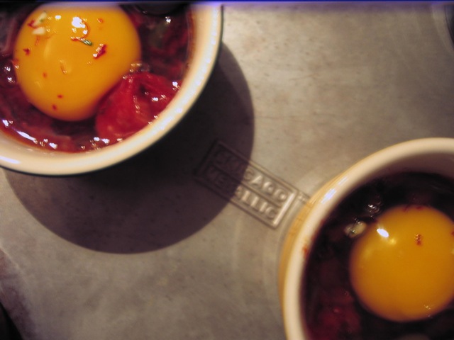 Brunch. Does that word scare you? I hope it does not. Different. Is that what you want your presentation to be? It can happen! I don't know about you, but I am frittata'd out. I love frittatas, don't get me wrong. They DO serve groups egg-cellently, (pardon the pun) but something in me wants to surprise my friends. "Wow" them, per se. Brunch is fun, just like the friends you invited, so stop scrambling (pardon the second pun) for new menu options and start baking. Baking? Not breakfast baked goods, but eggs. Spanish inspired eggs. We made a sauce: 2 red bell peppers peppers, diced 1 small onion, diced Several dashes of sherry (to deglaze the pan) 1 can of diced tomatoes (or 3 fresh on-the-vine, diced) 1 Tsp. of tomato paste Some chopped fresh parsley We put this sauteed mixture on the bottom of 6 ramekins, or one for each person. On top, we placed 1 egg in each ramekin (don't forget to spray cooking spray or brush some oil in the ramekins to prevent the egg/sauce from sticking). Throw in a pitted olive. On top of the yolk, (as garnish and flavor,) we crushed some saffron threads and sprinkled some minced garlic on the top of each. Bake at 400 degrees for 20-30 mins. until the eggs, especially the yolks, are set. I like mine well done, so I kept them in the oven for 30-35 mins. Not only are these little guys cute, but they are special, delicious, and definetly not your every-day brunch fare. Well, at least for a group of 4-6 people. How easy is it to sautee some goodies in a pan and crack an egg on top? Super simple, and you'll probably get an "Ooooo" from your friends. Little effort, big results. While the eggs are in the oven, toss a green salad to accompany your Spanish eggs. Slice a baguette. Kick back, relax, and enjoy a virtual stress-free brunch. To see a couple of shots from this cooking adventure, see this link: http://www.flickr.com/photos/37131131@N03/