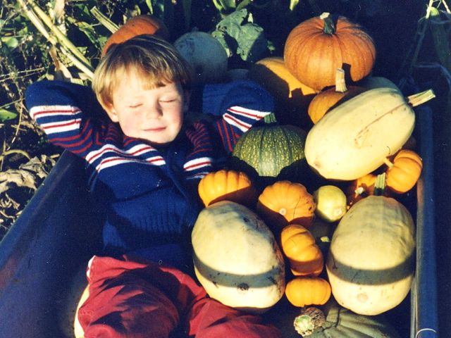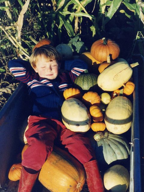 When sunlight streams through the red and yellow grape leaves as if they’re made of greased paper, when the walnut spreads a gold carpet of leaves across the driveway and pelts the roof with its black-husked nuts, when the new grass shimmers as green as in April and everything looks brighter in the clean air, it’s time to bring in the pumpkins and other winter squashes. They should be hard-shelled and full-colored now, dark green as the cedars, yellow and orange and red as the leaves dropping all around. The thick stems of the maximas should have turned woody, ready to separate from the dying vines. You need strong clippers for the bigger pepos; cut the stems to just an inch or two. Be careful not to break off a stem, or rot will set in early at the wound site. A light frost or two will have done the squashes no harm. If you’ve let them sit out through weeks of rain, well, you probably should have got to them sooner. Scrub off the mud, and let the squashes dry. Set them in the sun or another warm place for at least a few hours; I put mine on a sunny deck on the south side of the house. In a wet autumn, a spray or wipe of bleach water may ward off fungus. [%image sam float=right width=300 caption="Sam and the pumpkins."] “Experts” will tell you to store your squashes at 50 degrees. If you’re thinking of a damp shed or basement, though, think again. Dampness makes squashes rot before their time. A better choice is a cool room in a heated house. My squashes keep well in laundry baskets in the dining room until March, at least. This past August, in fact, I fed the ducks the last of last year’s harvest — a few spaghetti squashes and Jack-Be-Littles — although they showed no signs of decay. But I wanted to save my appetite for the new crop. Maybe you have some really big squashes — say, blue-gray Sweet Meats (Oregon heirlooms) or a Cinderella-style Rouge Vif d’Etampes. How do you get at the flesh? In Traditional Portuguese Cooking,_ Maria de Lourdes advises, “Break the squash by hurling it to the ground.” But Maria is telling you how to make pumpkin jam; sometimes you need a cleaner cut. For that, you might strike with a cleaver once or twice before dropping the squash hard on a counter. Or you might gash the squash with a long knife — my husband bought me a 14-inch chef’s knife for this purpose — and then hit the back of the blade with a mallet. Maybe instead you’d like to cut off the top of your squash jack-o-lantern style. Then you can scoop out the seeds and bake the squash whole, so you can serve it with soup or stuffing inside. I do this with miniature pumpkins, which are delicious with just a little pat of butter or a custard filling. Whatever sort of squash you’re cooking, don’t throw out the seeds. Tossed with a little salt and oil and roasted, squash seeds make an excellent snack. Another Oregon heirloom variety, Golden Delicious, is today grown commercially just for its seeds. The flesh, though sweet and smooth (it was developed for baby food), is spit out by the harvest machine and tilled into the soil. My favorite way to cook winter squash is to bake halves cut-side down. A good dry, sweet squash will leak into the pan not water but a little thick, tasty syrup — the cook’s kitchen treat. Cut slices of the baked squash for dinner, or spoon out the flesh and mash it. Taste it before seasoning it; you may finds it needs no butter and maybe not even salt. What do you do with the leftover flesh from a big squash? I purée it all. If the squash is a bit stringy, I use a food mill, but otherwise I use the KitchenAid mixer. The purée goes into plastic containers in the freezer, where it’s ready to thaw for pie or bread or soup or ice cream or a dish of plain old puréed squash. I am embarrassed to write this — no respectable householder keeps any frozen food for more than 12 months — but puréed squash keeps well in the freezer for several years. With your squashes serving as home décor and an occasional meal, you can put up your feet and wait for the seed catalogs to arrive. If you’re like me, you’ll pick out an old favorite squash or two for next year, and then you’ll choose a new one that promises to be sweeter, creamier, or prettier than any you’ve tried before. p(blue). Culinate editor's note: This post also appeared on Linda Ziedrich's blog, A Gardener's Table.
