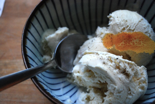 Click here for full post. If you ever lived in Charlottesville, VA in the 90's or early 00's you probably saw a bunch of bands in the basement of the Tokyo Rose. Those, my friends, were the days. Night after night of crazy, perfect, awesome shows and upstairs amazing sushi. Almost all my friends worked there in some capacity at some point. I spent my youth eating sushi and listening to indie rock all at the same place. Sniff, the Tokyo Rose, that version, is gone and the heyday of indie rock is on the downswing, but I can still pop open a Kirin Ichiban and have some ginger ice cream. Homemade fresh ginger ice cream is an upgrade from the standard sushi restaurant fare, but it still has that amazing warm flavor that comes from frozen cream, which would be comforting even if it didn't flood you with a wave of nostalgia for your squandered youth. Oh, but, did you buy that ice cream maker yet? Ginger's bright, crisp flavor and mild heat is a great counterpoint to fall foods. After curing for a few days the cream fully absorbs the ginger and orange, and the ice cream is silky with a little bite. I guess all homemade ice cream is festive, but this is especially so. You could even make the argument that you need to eat it after a big meal; ginger, after all, is a digestive aid. Ginger Ice Cream with Black Pepper and Orange Zest (adapted from the Big Sur Bakery Cookbook, by Michelle Wojtowicz, Phillip Wojtowicz, Michael Gilson and Catherine Price) 2 cups heavy cream 2 cups whole milk 4 tablespoons honey 1 cup sugar 4" section of fresh ginger peeled and sliced 4 egg yolks a big pinch of salt zest of one orange 4-6 turns of freshly ground black pepper Put the ginger in a small saucepan and just cover with water. Bring it to a boil and then let it steep for 10 minutes. Dump the water and then combine the ginger and 1 cup of milk in a blender. Blend well, for two minutes or more. Combine the milk and ginger mixture, and the rest of the milk, the cream, honey, salt, and half the sugar in a large saucepan and cook over medium heat, when the cream mixture is starting to steam set aside for ten minutes to allow for even more steeping. Bring the heat slowly back up and put the yolks in a heat proof bowl whisking in the other half of the sugar and the orange zest. Whisk a cup or so, 1/4 cup at a time, into the eggs. The goal is the raise the heat of the eggs so they won't curdle when added to cream. Whisk the tempered eggs into the cream mixture. Cook over medium heat until the custard begins to thicken and coat the back of a wooden spoon. Pour into a large bowl, cover and chill for a long time--3 hours at least. Then process according to your ice-cream maker's instructions. Please note that this makes slightly less than 2 quarts of ice cream, so you might need to process the ice cream in two batches. Remove from ice cream maker and freeze for as long as you can wait. Three hours is good, but this ice cream is at it's best once it has cured for a few days. Serve with a twist of orange peel and a dash of fresh pepper.