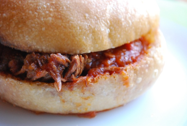 I love sloppy joes, but the name kind of sucks. I don't think it's a good idea to remind people that like half the meat is going to fall out the back of the bun as soon as you pick it up, and another quarter is probably going to spill out the front and onto your shirt, and if you do somehow keep the thing together, unless you wolf it down, by the time you get to the end, it's going to have soaked through the bun and the whole thing is going to fall apart before you are done. In fact, it may be the worst sandwich name this side of "loose meat sandwich." The loose meat sandwich is like a sloppy joe without the tomato and I can't think of a less appetizing name. At best, it sounds like its made from a slurry of undifferentiated animal parts. It's also the kind of sandwich that Roseanne and her sister and Nancy sold at their diner on "Roseanne." I wish that instead of remembering what Roseanne sold at her diner, the theme song to "Ducktales," and Mr. Belvedere's first name, I remembered things like the names of people I've met and which night recycling goes out, but that's not the kind of person I am. Anyway, these are fancy joes, because I like that name better and because they don't use ground beef. I used chunks of beef stew meat from the butcher for this, so I don't even know what cut it was, but anything good for braising will work. They are still pretty sloppy, so use a slotted spoon to serve them. Fancy Joes makes 4-6 sandwiches 1 lb. beef cut into about 1 inch chunks 1 can whole peeled tomatoes one onion diced 2 tbsp. honey 2 tsp. hot paprika 1 tsp. chili powder 1 tsp. cayenne salt pepper olive oil -Salt and pepper the meat and brown it on all sides on high heat in a heavy pot. -Remove the meat to a bowl, turn the heat to medium, and add the onions. If the pot is dry, use a little olive oil. -When the onions are translucent, add the tomatoes, one at a time, smashing them in your hand as you add them. Dump in about half the tomato juice and save the rest to add later if you feel like it. Return the meat and add the spices and honey. Turn the heat to high and when the liquid begins to boil, turn it to low and cover. -Braise the meat in the tomatoes for about four hours. -Serve on buns.