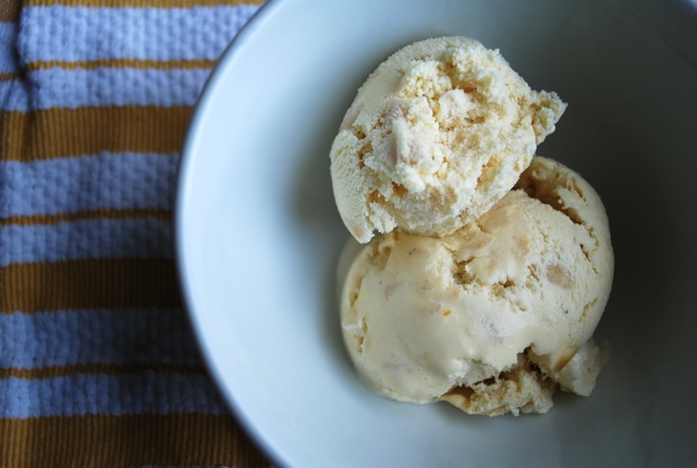 This recipe is really complicated. Pears are so quiet it's a bit of a feat to coax so much flavor out of them. This ice cream has a deep pear flavor with butterscotch and vanilla undertones. Somehow light, true to the cream, and rich. Definitely time well spent. A note on the recipe: The inspiration for the pear preparation came from Sprouted Kitchen, where the roasted pears are the main attraction. I had been wanting to make a rich pear ice cream and her recipe seemed like it would bring out perfect pear flavors. I consider it a total success. Roasted Pear Ice Cream with Honey and Vanilla 4 small bosc pears, peeled, halved, and cored 2 tablespoons butter 1/2 cup honey 2 tablespoons turbinado sugar 1/2 teaspoon salt 3 tablespoons rum 2 cups whole milk 2 cup heavy cream 4 or more egg yolks 1 vanilla bean 1/4 cup sugar 1 tablespoon vanilla Preheat the oven to 350 degrees. Combine the butter, sugar, honey and salt over medium heat and cook for two minutes. Things will be quite bubbly. Then add the pears and cook, flat side down, for 2 to 4 minutes. Then place in the preheated and cook for 15 minutes. Remove from oven and set aside to cool. Meanwhile, combine the cream and milk in a large saucepan and cook over medium heat until the mixture starts to steam. Add the vanilla bean and turn the heat off while the vanilla bean steeps in the cream for ten minutes. Put the yolks in a heat proof bowl and whisk in ¼ cup sugar. Remove the vanilla bean, scrape the seeds into the cream, and then reheat the cream mixture until it is starting to steam, and whisk a cup or so, ¼ cup at a time, into the eggs. The goal is the raise the heat of the eggs so they won't curdle when added to cream. When the eggs are tempered, slowly whisk into the cream. Stirring constantly, cook over low heat roughly 5 minutes, or until the cream mixture has thickened and coats the back of a wooden spoon. When the pears have cooled, remove them from the caramel and dice. Put the diced pears in a bowl, cover, and put into the refrigerator. Then stir the remaining caramel into the cream. Next, add 2 tablespoons rum to the pear cooking pan and deglaze briefly over medium-high heat for one minute. Scrape remnants into the cream and stir. Finally, add the tablespoon of vanilla. Pour into a large bowl, cover, and chill for a long time--3 hours or more is optimal. Process according to your ice-cream maker's instructions, adding the fruit once the ice cream is almost fluffy. You may need to make this in two batches. It also took a longer than usual processing time for the ice cream to set up. Remove from ice cream maker and freeze for as long as you can, three hours or more will result in a well-cured ice cream.