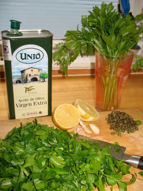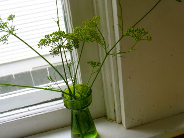 I am a posy poacher, like my mother. A former colleague taught me that term, and I’m glad to have found such a pleasant-sounding way to describe my slightly dubious habit. I try to stick to branches from street trees (especially this time of year, when there's little else) and prolific shrubs or flowers that are leaning into the public domain, are badly in need of pruning, or are invasive or neglected . . . You see I have many reasons why my swiping of branches and flowers to brighten my house is actually a useful and needed job. About five years ago I also, briefly, became a parsley poacher. I spied the most beautiful and substantial clump of parsley on my bike ride to the grocery store. It was in the strip between the street and the sidewalk in a jumble of weeds, in a crack between bricks, and it seemed to be exactly on the property line between two houses. I eyed this beautiful, green clump for a few weeks on my way to and from the store. It never changed, other than getting bigger and bigger. At this point I did not yet have a hearty crop of parsley of my own, and after weeks of watching this neglected plant, I did my first poaching. Now why I didn’t just ring the bell of both possible owners in question, I do not know, but I snitched parsley that day and weekly thereafter for most of the winter, always leaving plenty in case the owners did decide it was worth something. Of course, I realize I could have just bought a bunch of parsley at the grocery store every week, but somehow the discovery of that abundant clump, thriving with no care whatsoever, was so much more fun and interesting. [%image parsley float=left width=300 caption="Making salsa verde."] I grew up with an abundance of parsley. It was the bright green carpet on the edge of my mother’s vast garden that I was frequently sent out to pick in the rain and dark, as she was preparing dinner. She used parsley with skill and creativity, transforming plain white rice into the most wonderful one-pot meal with garlic and onion and green chiles stuffed with cheese, and she added it to tomato sauces and soups and cream sauces and gratins. I now use it in my own ways, and am especially drawn to it this time of year, when the sweet, rich root vegetables and squashes are in season, to which parsley offers a wonderful, fresh, bright counterpoint. I just finished a lunch of toasted whole-grain bread topped with two eggs over-easy and smothered with salsa verde — the Italian salsa verde, that is. [[block(sidebar). h1.Featured recipe]] These days, my neighbors and I collectively grow enough herbs to share around. Down the street, there’s a bay tree (and prolific parsley this year too!); up the street, there's rosemary and sage. I offer oregano, thyme, savory, and parsley to anyone in need. Now that I grow my own parsley and let it go to seed — keeping me in adequate supply year after year — I can also use the beautiful stalks to make bouquets, obviating the need for posy poaching. At least when it comes to parsley. [%image reference-image float=left width=600 caption="Parsley posies."]