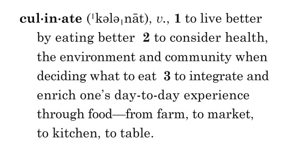 We're food people who write and word people who eat, so it only seems natural we would invent a new word to define what we're all about: "Culinate." dl(glossary). cul·in·ate: (\'kələ-nāt), v. 1 to live better by eating better 2 to consider health, the environment and community when deciding what to eat 3 to integrate and enrich one's day-to-day experience through food—from farm, to market, to kitchen, to table Then, because that was so much fun, we decided to gather all the words that help define what we do, most of which have been around for several centuries, and put them here. Enjoy! dl(glossary). com·mu·ni·ty: (kə-\'myü-nə-tE), n., 1 a group of people with a common characteristic or interest 2 society at large cook: (\'kuk), n., a person who prepares food for eating; v., to prepare food for eating, especially by means of heat 1858 MULOCK A Woman’s Thoughts About Women\: I am truly thankful, and sincerely indebted to her too; for a good cook is a household blessing. cul·in·ar·y: (\'kə-lə-ner-E, \'kyü-, \'kü-), adj., of or relating to the kitchen or cookery Etymology: Latin culinarius, from culina kitchen eat: (\'Et), v., 1 to take food or a meal 2 to consume gradually 3 to enjoy eagerly or avidly 1667 MILTON Paradise Lost\: Whoso eats thereof forthwith attains Wisdom. en·vi·ron·ment: (\in-'vI-rə (n)-mənt), n., 1 the circumstances, objects, or conditions by which one is surrounded 2 the complex of physical, chemical, and biotic factors (as climate, soil, and living things) that act upon an organism or an ecological community and ultimately determine its form and survival 3 the aggregate of social and cultural conditions that influence the life of an individual or community 1956 SEARS/THOMAS Man's Role in Changing the Face of the Earth\: The situation is clouded by a widespread confidence that this impact of man upon environment can continue indefinitely. farm: (\'färm), n., a tract of land devoted to agricultural purposes; v., to engage in raising crops or animals; obs., food, provision; hence, a banquet, feast 1807 CRABBE The Village\: Fields and flocks have charms / For him that gazes, or for him that farms. food: (\'füd), n., something that nourishes, sustains, or supplies Etymology\: Middle English fode; akin to Old High German fuotar food, fodder 1595 SHAKESPEARE King John\: My faire sonne, My life, my ioy, my food, my all the world. fresh: (\'fresh), adj., 1 having its original qualities unimpaired 2 not stale, sour, or decayed 3 not altered by processing 4 free from taint 1697 DRYDEN Virgil’s Georgics\: And seek fresh Forrage to sustain their Lives. ga·stro·no·my: (gas-\'trə-nä--mE), n., 1 the art or science of good eating 2 culinary customs or style 3 the study of the relationship between culture and food Etymology\: Greek gastros stomach and nomos law i·deal: (I-\'dEl), n., A conception of something, or a thing conceived, in its highest perfection, or as an object to be realized or aimed at; a perfect type; a standard of perfection or excellence kitch·en: (\'ki-chən), n., 1 a place (as a room) with cooking facilities 2 the personnel that prepares, cooks, and serves food 1616 SURFLET & MARKHAM Country Farme\: The first foundation of a good House must be the Kitchin. lo·cal: (\'lO-kəl), adj., 1 of, relating to, or characteristic of a particular place; not general or widespread 2 primarily serving the needs of a particular limited district mar·ket: (\'mär-kət), n., a meeting or gathering together of people for the purchase and sale of provisions or livestock, publicly displayed, at a fixed time and place <a farmers’ market>; the occasion or time of this; also, the people gathered at such a meeting 1918 LEACOCK Frenzied Fiction\: What amazes me, in returning to the city, is to find the enormous quantities of produce of all sorts offered for sale in the markets. re·ci·pe: (\'re-sə-pE), n., a set of instructions for making something from various ingredients Etymology\: Latin, imperative of recipere to take, receive sift: (\'sift), v., to go through, especially to sort out what is useful or valuable ta·ble: (\'tA-bəl), n., 1 a piece of furniture consisting of a smooth flat slab fixed on legs 2 an act or instance of assembling to eat 3 a group of people assembled at or as if at a table 1719 DEFOE Robinson Crusoe\: To make such necessary things as I found I most wanted, as particularly a Chair and a Table. p(bio). Sources: Merriam-Webster, the Oxford English Dictionary, Wikipedia