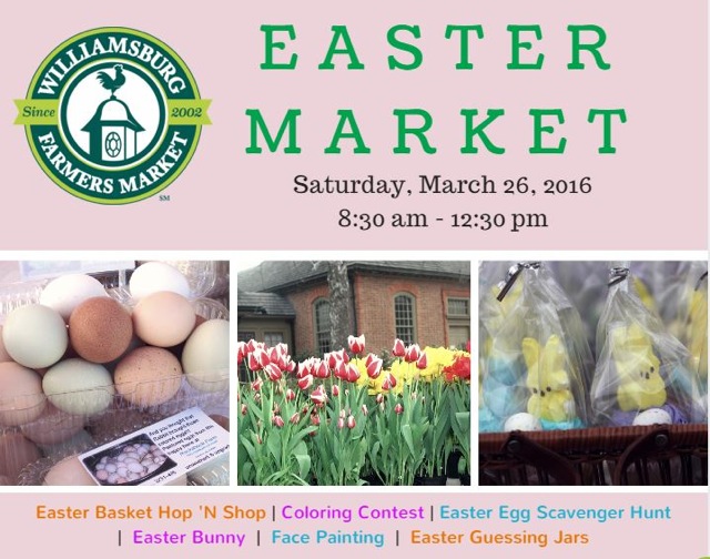 Hip hop hooray, Easter is on its way! Come join us at the Williamsburg Farmers Market for a fun-filled Eggs-travaganza, that the entire family will enjoy! Hop 'N Shop among our participating vendors for a change to win a Easter "basket" (gold Easter egg on tents of participating vendors), while the kids hippity hop all around, looking for Easter eggs hidden periodically at the vendors stalls filled with Bunny Bucks! Parents bring your cameras as the Easter Bunny will be on hand for pictures. There will be face painting, coloring contest and guessing jars too! Join us at the market to finish your Easter shopping! Our local bakers, candy makers and farmers have great, local options for your Easter eggs-travaganza! Gillian Guidice will be performing from 9:30 am until 11:30 am. The next market is April 2 from 8:00 am until 12:00 pm. The Market accepts SNAP/EBT, credit cards, and W&M Express. Check www.williamsburgfarmersmarket.com for available products and produce.